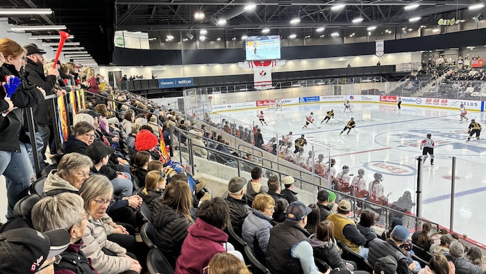 La demi-finale entre Moncton et Stoney s’est jouée dans une salle comble à l’UNIplex de Dieppe. Comme c’est l’habitude dans plusieurs arénas du N.-B., beaucoup de personnes restent debout pour regarder la partie.