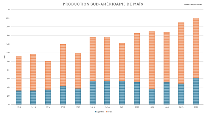 Avec l’avancée des récoltes de maïs en Argentine et la progression de la première moisson au Brésil, les perspectives de productions sud-américaines de cette année se sont encore sensiblement alourdies depuis le début du mois. La Conab a notamment remonté de 1,3 Mt son estimation de production brésilienne, à 139,6 Mt, proche du record établi l’an dernier (141,2 Mt), tandis que la Bourse de Buenos Aires, elle, a relevé de 3 Mt son estimation de production argentine, à un sommet historique de 61 Mt (contre 49 Mt l’an dernier) ! L’offre sud-américaine s’annonce ainsi encore particulièrement lourde cette année et devrait rapidement s’imposer à l’international, notamment sur le marché communautaire.