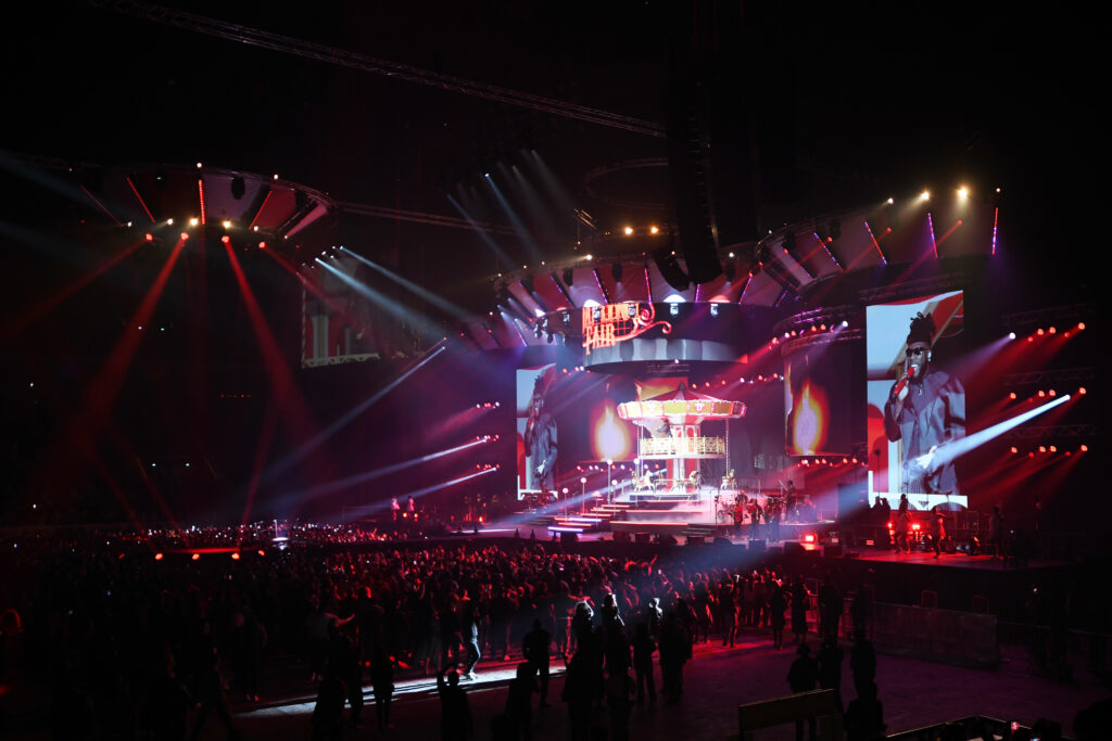 Il est 21h13, après une première partie assurée par plusieurs Dj, la plus grande salle d’Europe plonge dans le noir. L’ambiance monte, monte, les flashs des téléphones scintillent dans la pénombre. Soudain voilà la star de la soirée. Burna Boy dévoile une superbe scène bardée d’écrans géants dont l’un sphérique révèle un véritable carrousel, l’icône de l’affiche de sa tournée mondiale. Tout le public est munis de bracelets lumineux connectés offrant une scénographie réussie.