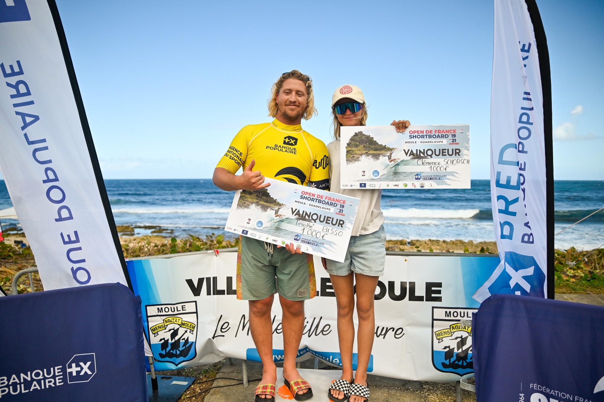 La Landaise Clémence Schorsch (15 ans seulement !) et le Guadeloupéen Tim Bisso se sont imposés en finale de la première étape du Banque Populaire Surf Tour 2024, disputée dans des vagues d’1m20 sur le spot du Moule, en Guadeloupe, ce dimanche. Kalani Giraud (St Barthélémy) et Jade Brocheton (Guadeloupe) remportent les finales juniors garçons et filles.
