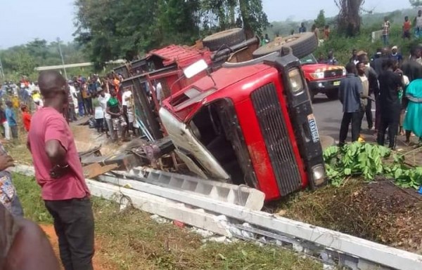 Selon les informations en notre possession, le drame est survenu lorsqu’un motocycliste refusant de s’arrêter à un barrage de corps habillés s’est retrouvé nez à nez avec le camion de transport des poteaux électriques. Ce dernier en voulant éviter le motocycliste s’est renversé sur les passants.