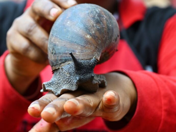 | Un escargot géant sur la main d’une employée dans une ferme d’élevage à Azaguié, en Côte d’Ivoire. |