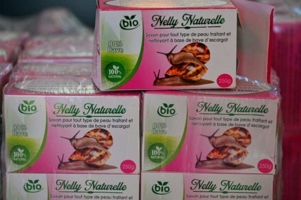 | Des savons fabriqués avec de la bave d’escargots dans une usine à Azaguié, en Côte d’Ivoire. |