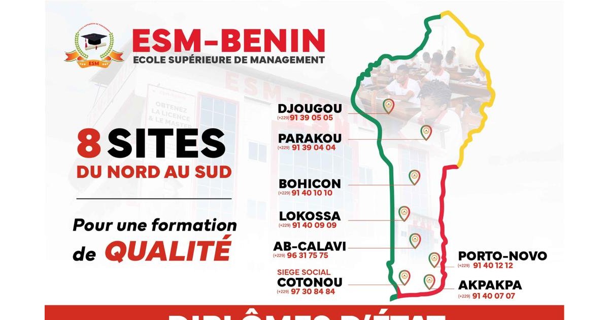 Depuis sa création en 2007, l’Ecole Supérieure de Management (ESM-BENIN) conforte sa présence sur le territoire national à travers ses nombreux sites répartis dans les grandes villes du pays. Le jeune bachelier, quelle que soit sa situation géographique, a la possibilité de s’inscrire sur l’un des sites de la prestigieuse université, et bénéficier des offres de formation.