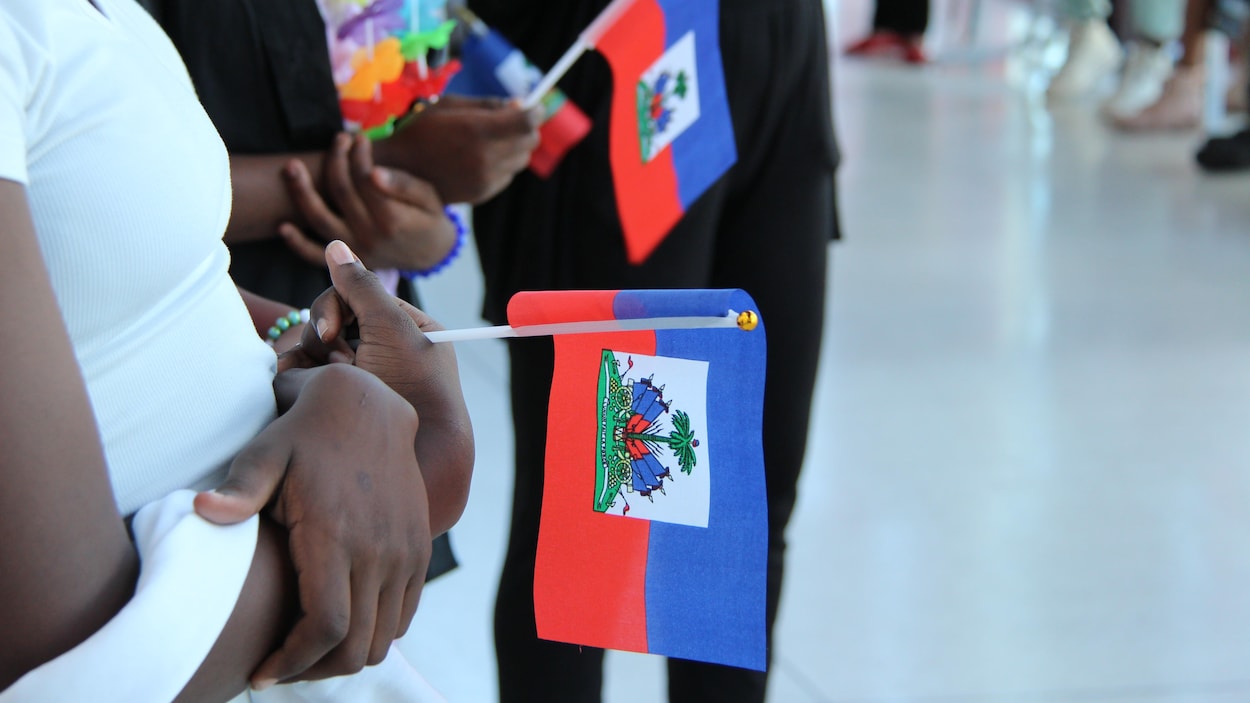 « Entre la tristesse et la joie, je préfère rester du côté de la joie parce que le drapeau haïtien, Haïti même, est un idéal », déclare Pierre Ebert Delcy, qui est accompagné de ses filles Aurélie et Brielle.