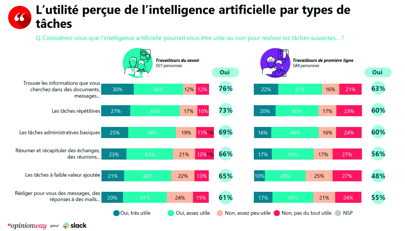Pour le compte de Slack, OpinionWay a interrogé des cols blancs et des cols bleus sur leur perception de l’intelligence artificielle. Les deux catégories de salariés estiment qu’elle leur fera gagner un temps précieux en éliminant un certain nombre de tâches à faible valeur ajoutée.