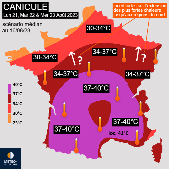Températures maximales envisagées les lundi 21, mardi 22 et mercredi 23 août 2023 – Météo Villes