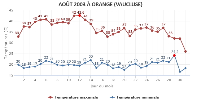 Températures minimales et maximales en août 2003 à Orange (84) – via infoclimat.fr
