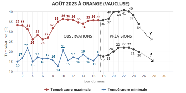 Températures mesurées et prévues en août 2023 à Orange (84) – via infoclimat.fr & Météo Villes