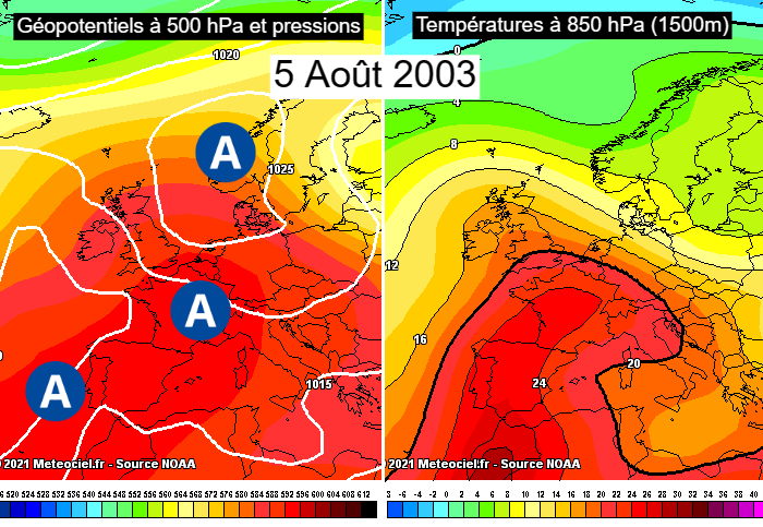 Situation météorologique et masses d’air à 1500m le 5 août 2003 – réanalyse via meteociel.fr