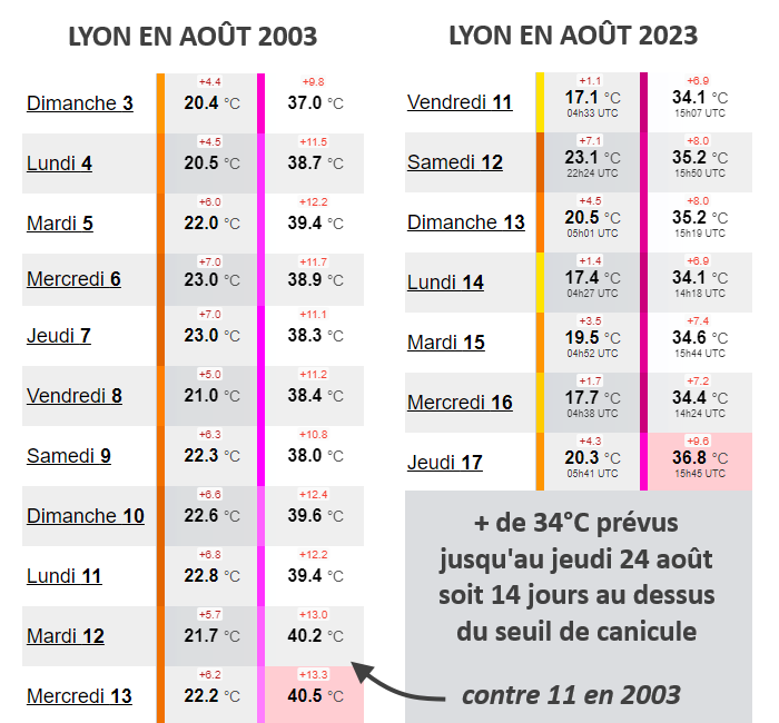 Comparaison des températures à Lyon en août 2003 et août 2023 – tableaux infoclimat.fr