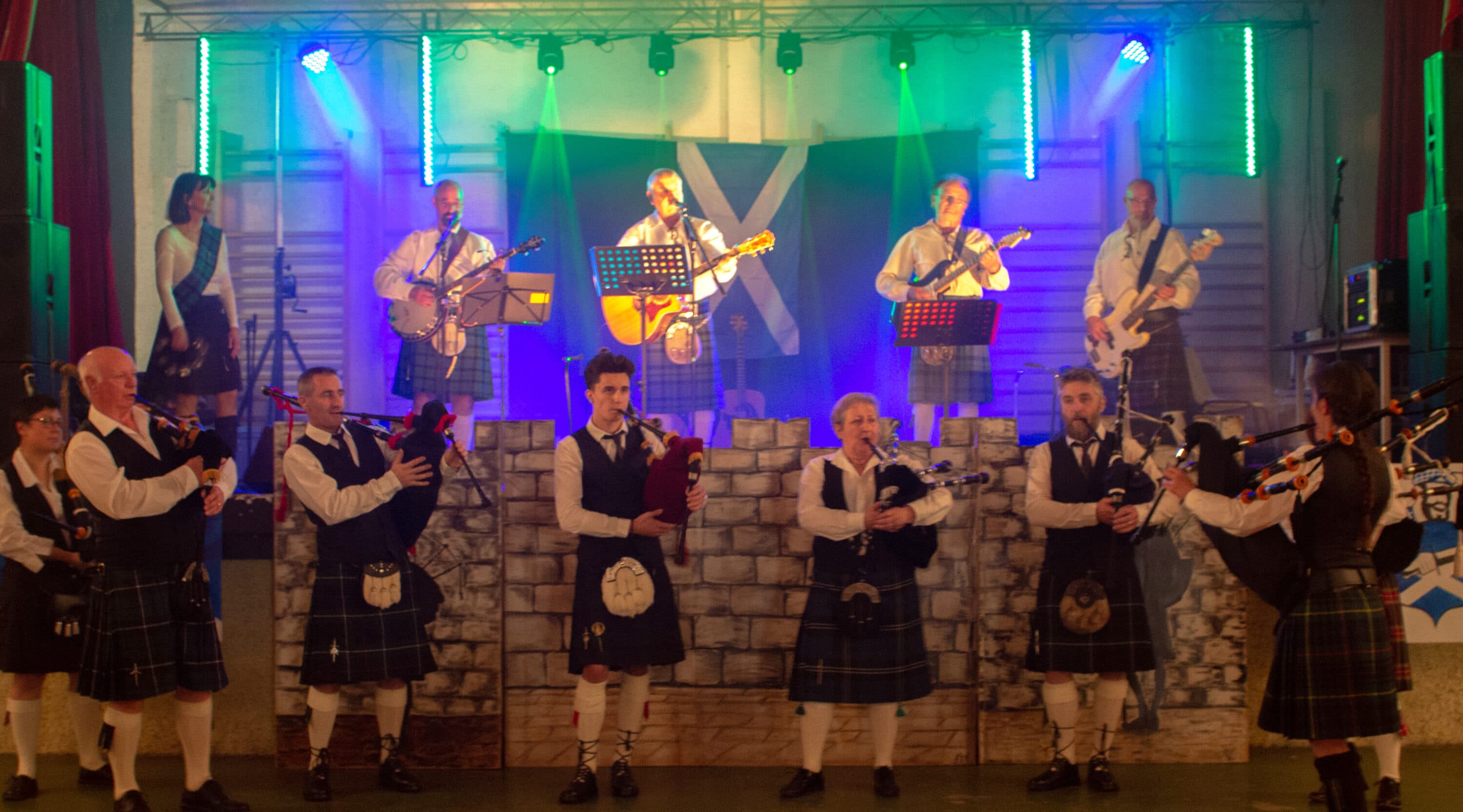Les deux groupes qui se produisent ce soir ne sont pas des inconnus. En effet, ils sont venus en avril 2019. Il s’agit d’un groupe de cornemuses The Desmans Pipers. Basé en Comminges, il joue des musiques écossaises. Belle présence musicale et scénique.