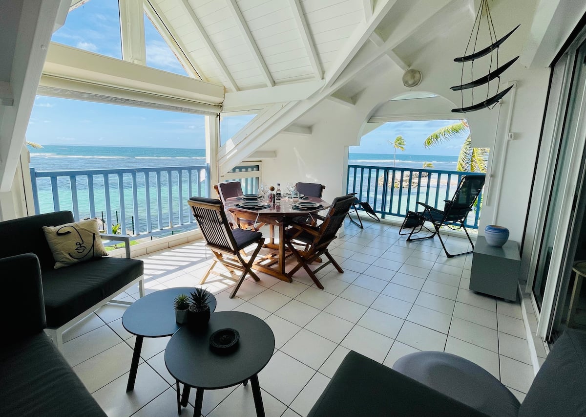 Appartement avec double vue sur le lagon depuis le deuxième étage. Il vous donne un accès direct à l’une des plus belles plages de Sainte-Anne (la plage du Bourg). La piscine circulaire commune, située dans la résidence sécurisée, offre également une vue panoramique sur la mer.