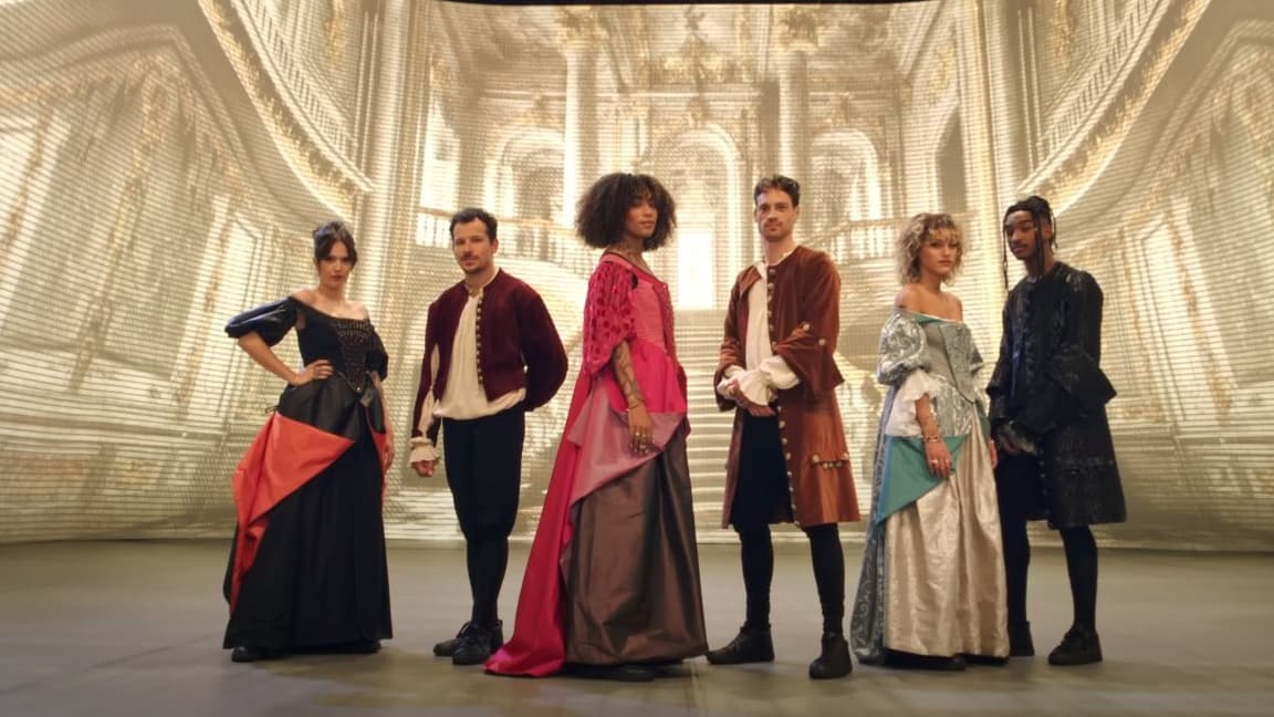 L’impressionnant décor est constitué d’astucieuses passerelles mobiles. Au deuxième acte, le Palais des sports de Paris se transforme comme par magie en théâtre royal. Pour actualiser ce Molière 2023, des marquises sont en patins à roulettes et la starisation du célèbre dramaturge est immortalisée par des photographes en habits de cour.