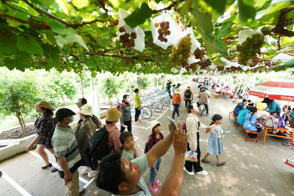 | Les touristes visitent la ferme de raisin de Suôi Tiên. |