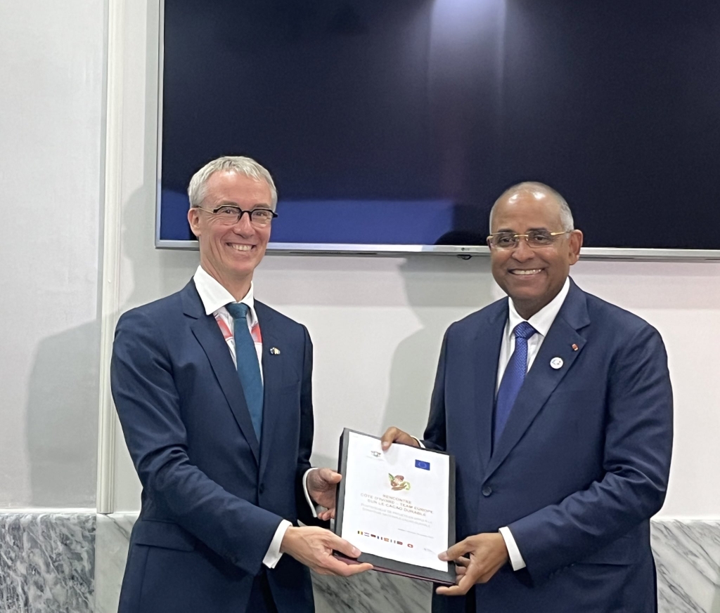 La visite de Koen Doens est l’occasion pour la Team Europe, composée de l’Union européenne, des États membres et de la BEI, en association avec la Suisse, de rencontrer le Comité national du cacao durable dont le comité d’orientation stratégique est présidé par le Premier ministre. Lors de ces échanges, l’Union européenne et la Team Europe ont réaffirmé leur satisfaction de voir la Côte d’Ivoire poursuivre ses efforts de transformation de son modèle de production de cacao afin qu’il intègre davantage la dimension de la durabilité. En soutien à la Stratégie nationale du cacao durable de Côte d’Ivoire, la Team Europe a présenté à M. le Premier ministre un portefeuille de projets d’une valeur de 37,7 millions d’euros (24,7 milliards de francs CFA) qui constituent une première étape dans la coopération sur ce sujet.